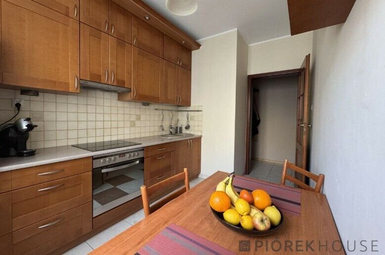 - w kuchni: zabudowa z drewnianymi frontami, piekarnik, lodówka,