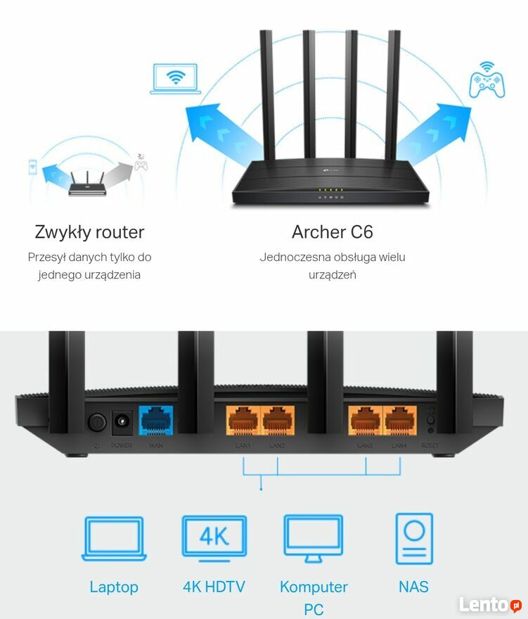 Router Archer C6 rozgłasza dwie oddzielne sieci bezprzewodowe w pasmach 2,4GHz i 5GHz, zapewniając bardzo wysoką wydajność połączeń bezprzewodowych. Daje to możliwość jednoczesnego korzystania z dwóch dedykowanych sieci bezprzewodowych - o prędkościach odpowiednich dla nawet najbardziej wymagających zastosowań. Dzięki temu można korzystać z codziennych, mniej wymagających aplikacji, takich jak poczta elektroniczna czy przeglądarka internetowa, poprzez połączenie w paśmie 2,4GHz, przy jednoczesnym wykorzystaniu pasma 5GHz do bardziej wymagających, wrażliwych na opóźnienia zastosowań takich jak transmisje strumieniowe wideo w jakości HD lub gry online. Najnowszy protokół zabezpieczeń sieci Wi-Fi, WPA3, daje nowe możliwości w zwiększaniu bezpieczeństwa cybernetycznego prywatnych sieci. Silniejsze szyfrowanie hasła sieci Wi-Fi i zwiększona ochrona przed atakami typu Brute Force gwarantują bezpieczeństwo domowej sieci Wi-Fi.Cztery anteny zewnętrzne o wysokiej wydajności dostarczą sygnał Wi-Fi do każdego zakątka twojego domu. Technologia Beamforming umożliwia wykrywanie urządzeń i przesyłanie w ich kierunku mocnego sygnału Wi-Fi, nawet jeśli znajdują się w odległej lokalizacji. Dzięki technologii MU-MIMO, Archer C6 może wysyłać dane do kilku urządzeń jednocześnie.Nielimitowana rozrywka bez opóźnień na wszystkich urządzeniach staje się rzeczywistością.