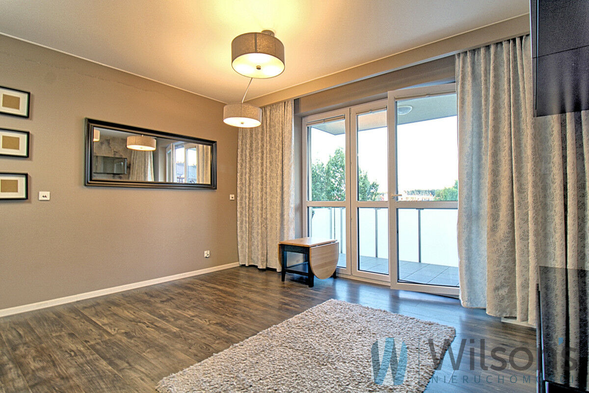 Salon z orientacją południową (rolety odbijające światło słoneczne), podtynkowa instalacja do kina domowego i wyjście na loggię.