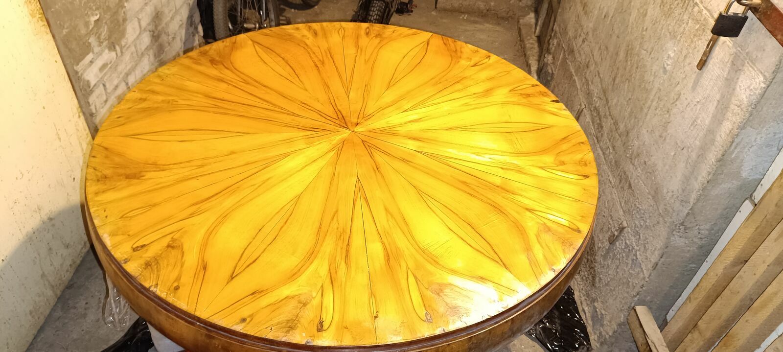 Okrągły stół w stylu Biedermeier, prawdopodobnie wykonany z orzecha lub innego szlachetnego drewna, fornirowany i charakteryzujący się typowym dla tego stylu, prostym, ale eleganckim wzornictwem z delikatnymi intarsjami lub usłojeniem tworzącym wzór na blacie. Więcej info pod nr.515 - pokaż numer telefonu -Sprawdź zainteresowanie tym ogłoszeniem